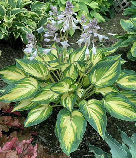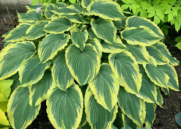 Sport of H. 'Sagae', with much wider yellow border that turn creamy white in summer.